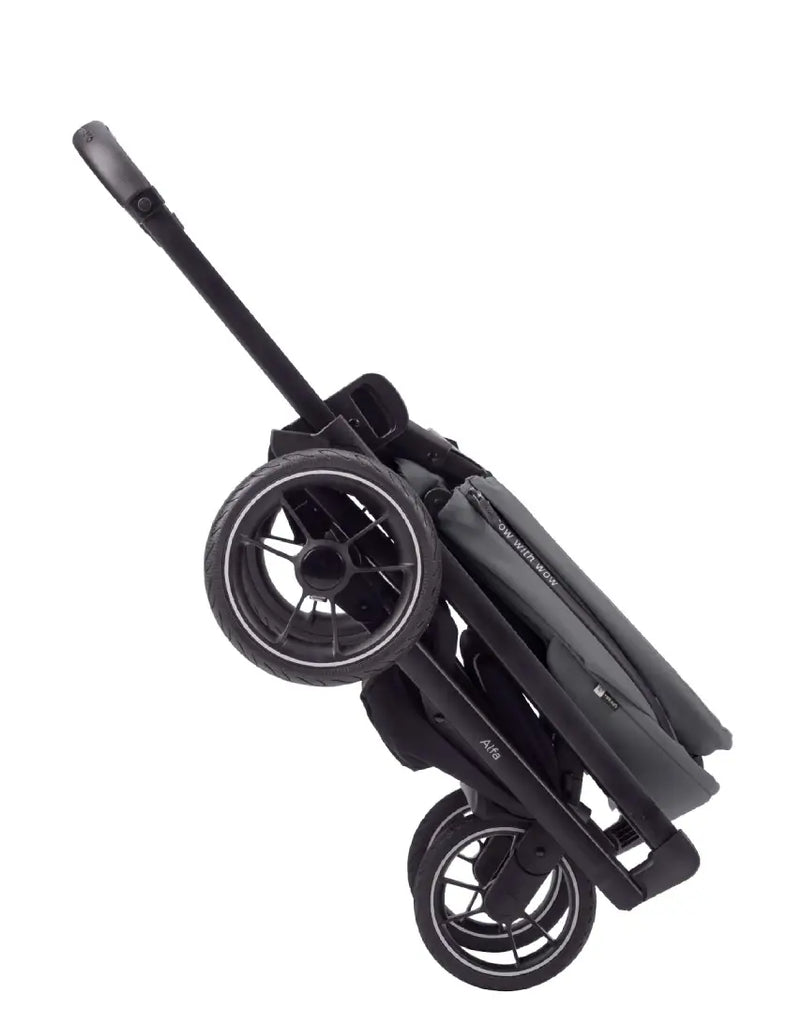 Wózek można złożyć w kompaktowy sposób, a po złożeniu stoi zarówno pionowo, jak i poziomo, co ułatwia przechowywanie i transport.